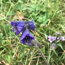 阴山乌头(变种)与伏毛铁棒锤的区别:花较大,上萼片盔形,高1.7-2厘米,有爪,蓝色。