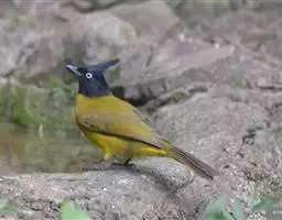 黑头鹎:体长17厘米。是一种中等体型的偏黄色鹎。特征为头辉黑、喉黑而眼蓝。上体黄橄榄色;两翼及尾偏黑,…