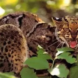 虎猫(学名:Leopardus pardalis):共有10个亚种,躯体均匀,四肢中长,趾行性。头大而圆,吻部较短,视、听、嗅觉均很发达。犬齿及裂齿极发达;上裂齿具三齿尖,下裂齿具2齿尖;臼齿较退化,齿冠直径小于外侧门齿高度。皮毛柔软,具显著花纹。前足5趾,后足4趾;爪锋利,可伸缩。