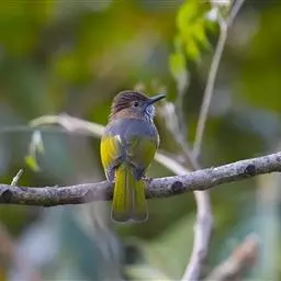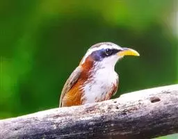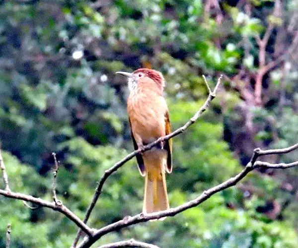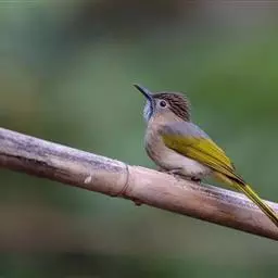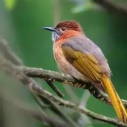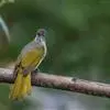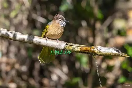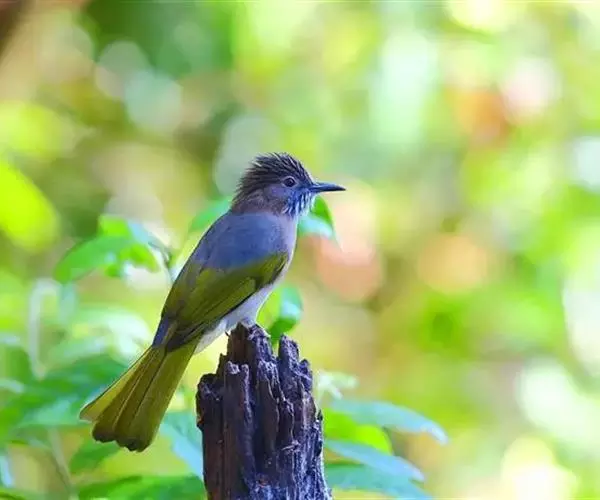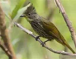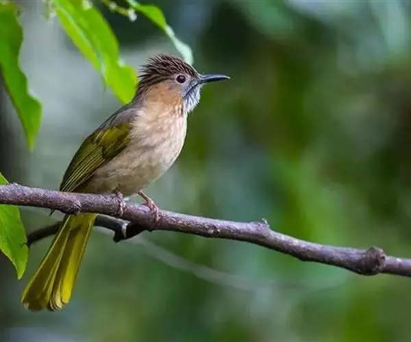 绿翅短脚鹎(学名:Hypsipetes mcclellandii):共有9个亚种。中型鸟类,体长20-26厘米。头顶羽毛形尖、栗褐色具白色羽轴纹,在暗色的头部极为醒目。上体灰褐缀橄榄绿色,两翅和尾亮橄榄绿色。耳和颈侧红棕色,颏、喉灰色,胸灰棕褐色具白色纵纹,尾下覆羽浅黄色。