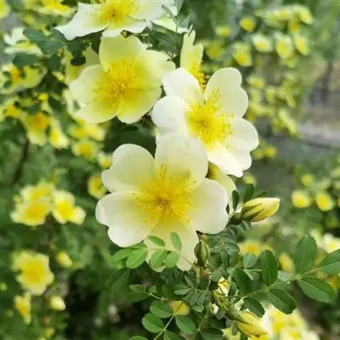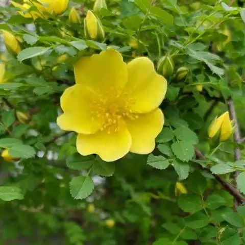 黄刺玫是蔷薇科蔷薇属的直立灌木。高2-3米;枝粗壮,密集;小叶片呈宽卵形或近圆形,边缘有圆钝锯齿,…