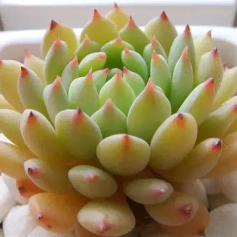 灯美人是景天科的园艺品种,多肉植物。叶片近柱状,丛生,在日照时间长、温差大的环境下会呈现橙粉色。