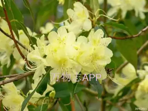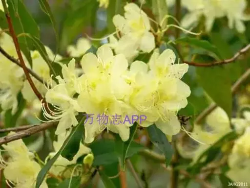 黄花杜鹃(学名:Rhododendron lutescens Franch.):灌木,高1-3米。幼枝细长,疏生鳞片。叶散生,叶片纸质,披针形、长圆状披针形或卵状披针形。花1-3朵顶生或生枝顶叶腋;宿存的花芽鳞覆瓦状排列;花萼不发育,波状5裂或环状;花冠宽漏斗状,略呈两侧对称,长2-2.5厘米,黄色,5裂至中部,裂片长圆形;雄蕊不等长;子房5室,花柱细长,洁净。蒴果圆柱形。花期3-4月。