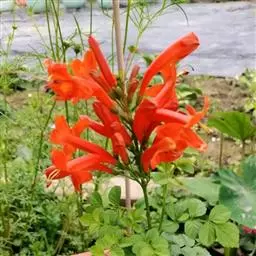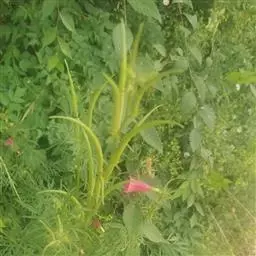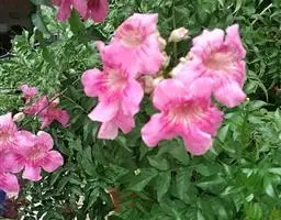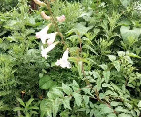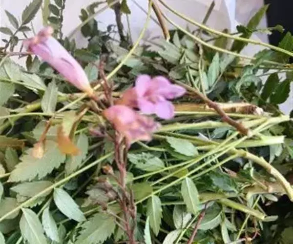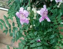 多年生具茎草本,分枝,高达1.5米。叶互生,为1回羽状复叶,不聚生于茎基部,长约15厘米;小叶5-11枚,卵状披针形长3-5厘米,宽15-20毫米,顶端长渐尖,基部阔楔形,两侧不等大,边缘具锯齿,上面深绿色,疏被微硬毛,下面淡绿色,无毛。顶生总状花序,有花6-20朵;苞片钻形,长3毫米,小苞片2,长不足1.5毫米;花梗长0.8-2.5厘米。花萼钟状,长5-8毫米,萼齿5,钻形,长1-4毫米,基部近三角形。花冠淡红色、紫红色或粉红色,钟状长漏斗形,长约4厘米,直径约2厘米;花冠筒基部紧缩成细筒,裂片半圆形,长约1厘米,宽约1.4厘米。雄蕊4,2强,着生于花冠筒近基部,长1.8-2.2厘米,不外伸;花药成对连着,丁字形着生。花柱细长,柱头舌状,极薄,2片裂,子房细圆柱形。果线状圆柱形,革质,长约20厘米。种子细小,多数,长椭圆形,两端尖,被丝状种毛。花期3-7月,果期9-12月。