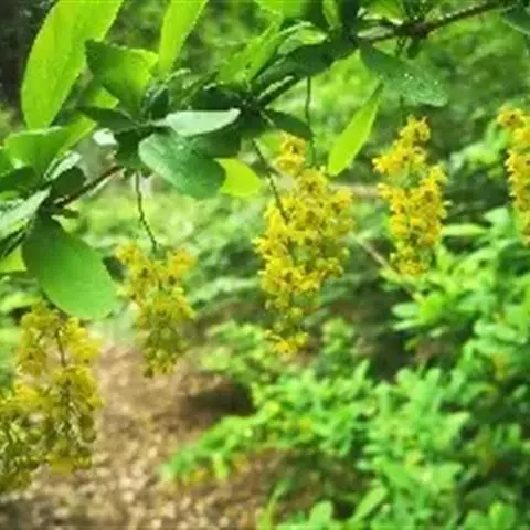 大叶小檗是小檗科小檗属植物,常绿灌木,高可达2米。老枝具棱槽,叶革质,椭圆状倒披针形,基部楔形,上…