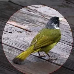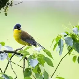 黄喉噪鹛体型略小,顶冠蓝灰色,特征为具黑色的眼罩和鲜黄色的喉。上体褐色,尾端黑色而具白色边缘,…
