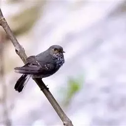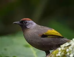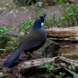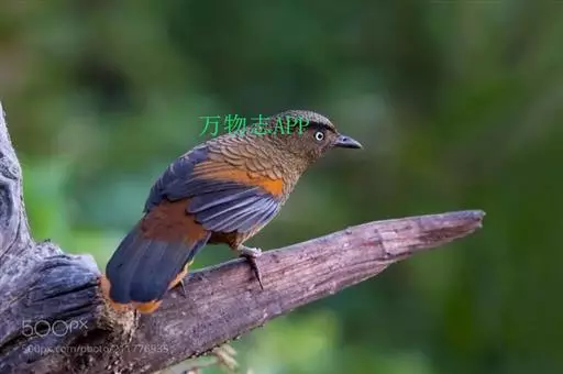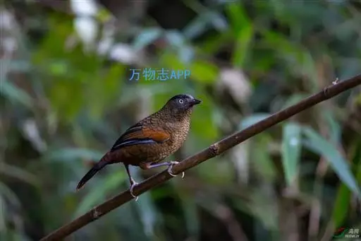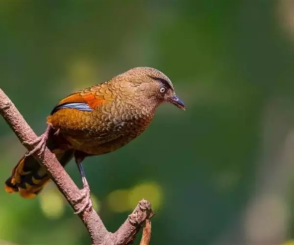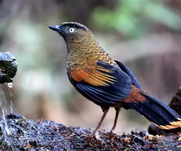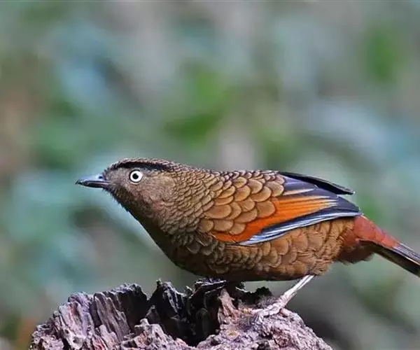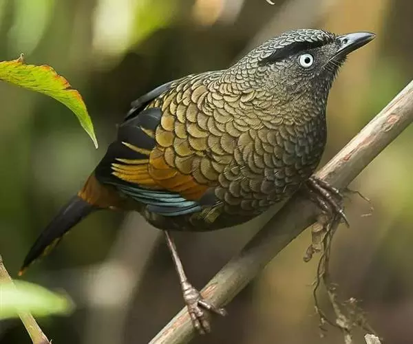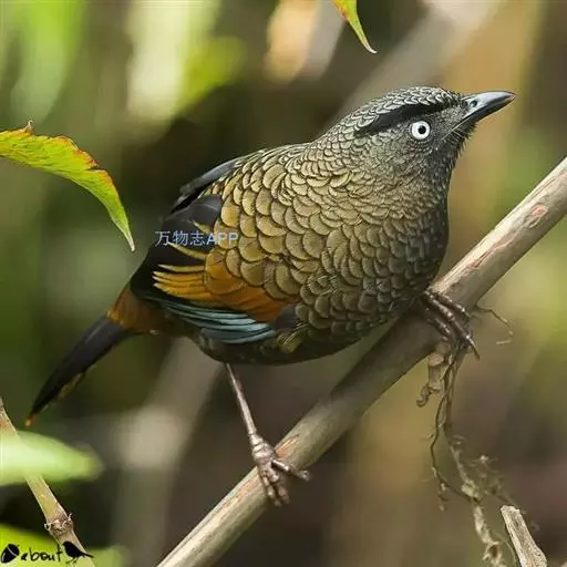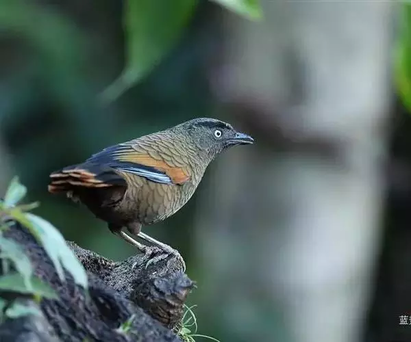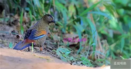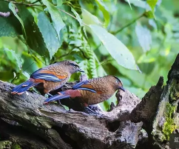 蓝翅噪鹛(学名:Garrulax squamatus):中型鸟类,体长22-25厘米。上体棕橄榄褐色密被黑色鳞状斑,眼蓝白色,眼上有一长而宽阔的黑色眉纹,从眼先直到颈侧。下体棕褐色被黑色鳞状斑;尾上和尾上覆羽栗色,尾黑色具棕色端斑;翅上覆羽栗色,初级覆羽灰黑色;飞羽黑褐色,外侧飞羽外翈蓝色,内侧飞羽基部亮栗色。