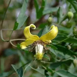 聚伞花序腋生,常1(-3)花;苞片羽状细裂;花钟状下垂,直径1-1.5厘米;萼片4枚,淡黄色,长方椭圆形或狭卵形,长1.5-2厘米,宽5-8毫米,两面近于无毛,外面仅边缘上密被乳白色绒毛,内面有三条直的中脉能见;雄蕊长为萼片之半,花丝扁平,线形或披针形,中部宽达1.5毫米,两端渐窄,中上部被稀疏柔毛,其余无毛;子房扁平,卵形,被短柔毛,花柱被绢状毛。