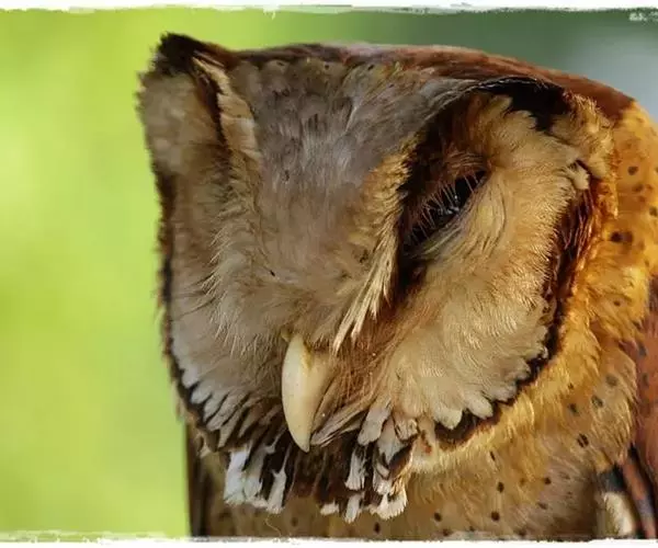 草鸮是中型猛禽。体长32厘米,翼展116厘米,体重450克。上体暗褐,具棕黄色斑纹,近羽端处有白色小斑点。似仓鸮,面盘灰棕色,呈心脏形,有暗栗色边缘。飞羽黄褐色,有暗褐色横斑;尾羽浅黄栗色,有四道暗褐色横斑;下体淡棕白色,具褐色斑点。嘴黄褐色。爪黑褐色。虹膜-褐色;嘴-米黄色;脚-略白。