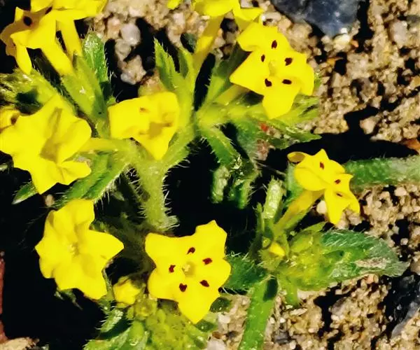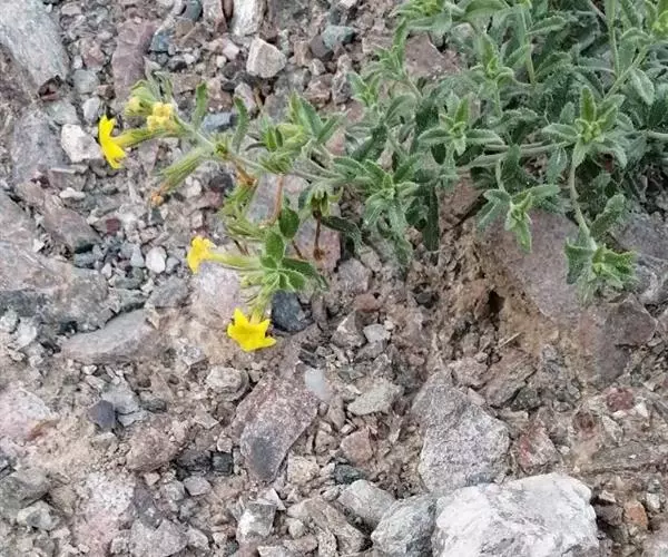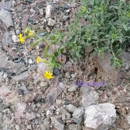 多年生草本。根稍含紫色物质。茎高20-30厘米,有疏分枝,密生灰白色短柔毛。叶 无叶柄,狭卵形至线状长圆形,长1-2厘米,宽2-6毫米,先端急尖,两 面都有短伏毛和具基盘的短硬毛,边缘具钝锯齿,齿端有硬毛。镰状聚伞花序长1.5-5厘米,有数朵花,排列较疏;苞片与叶同型。花萼长约1厘米,裂片线 形,两面密生长硬毛和短硬毛;花冠黄色,筒状钟形,长15-22毫米,外面有短毛,檐部直径5-7毫米,常有紫色斑点;雄蕊着生花冠筒中部(长柱花)或喉部(短柱花),花药长约1.6毫米;子房4裂,花柱丝状,稍伸出喉部(长柱花)或仅达花冠筒中部,先端浅2裂。小坚果三角状卵形,长约2.7毫米,有疣状 突起和短伏毛。花果期6-9月 。