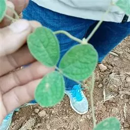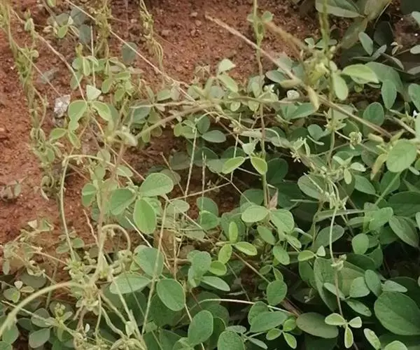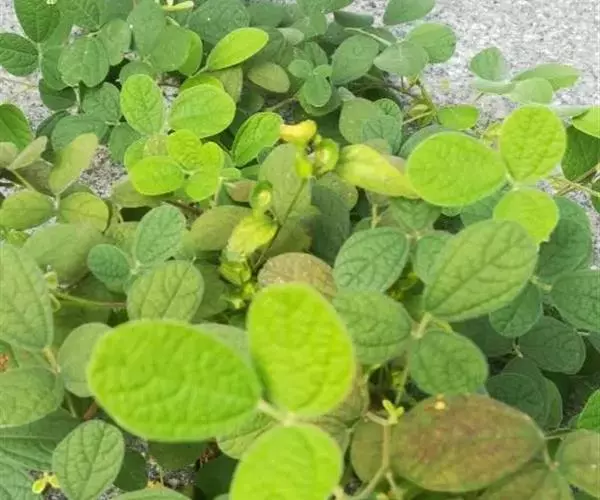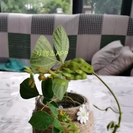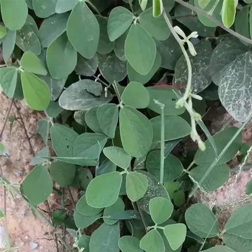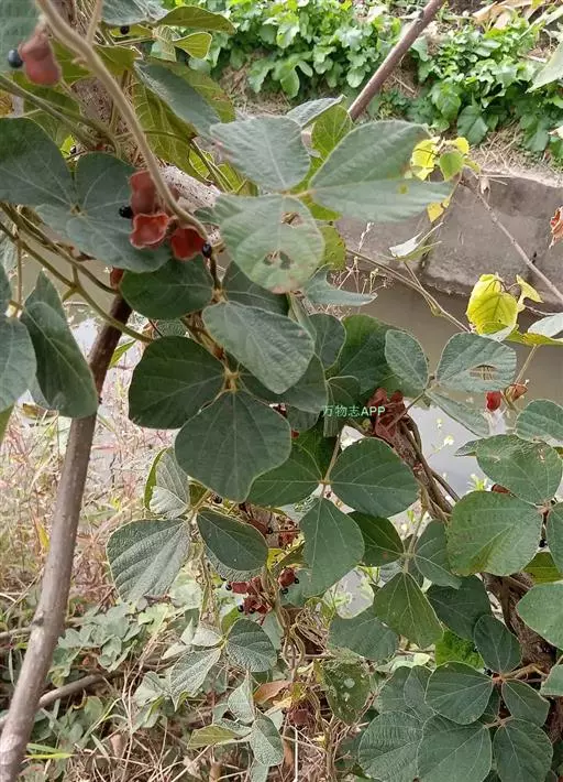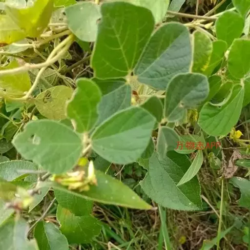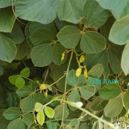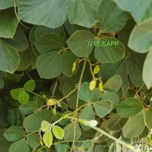 多年生缠绕草本。各部密被淡黄色柔毛。茎蔓长。3出复叶,顶生小叶近于圆形,长2.5~6cm,宽2.5~5.5cm,先端急尖或短渐尖;侧生小叶斜阔卵形,或斜阔椭圆形,长2~6cm,宽1.5~2.5cm,先端急尖,基部圆形;叶片纸质,上面疏被短柔毛,背面密被长柔毛和橘黄色透明腺点;托叶线状披针形,不脱落。总状花序腋生,花10余朵;长约7mm;花萼钟状,5裂;花冠黄色,龙骨瓣有长喙;雄蕊10,二体,花药1室;子房上位,胚珠2,花柱长,基部弯曲,被毛,柱头头状。荚果短,长圆形,红紫色,长约1.5cm,阔约9mm;种子1~2粒,黑色,有光泽。花期5~9月,果期7~10月。