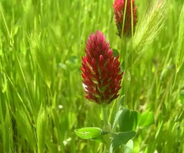 绛车轴草(学名:Trifolium incarnatum L.)是蝶形花科车轴草属植物,一年生草本,高30-100厘米。主根深入土层达50厘米。茎直立或上升。掌状三出复叶;托叶椭圆形,膜质。花序圆筒状顶生,花期继续伸长,长3-5厘米,宽1-1.5厘米,果期缢缩闭合;花冠深红色、朱红色至橙色,旗瓣狭椭圆形,锐尖头,明显比翼瓣和龙骨瓣长;子房阔卵形,花柱细长,胚珠1粒。荚果卵形;有1粒褐色种子。花果期5-7月。