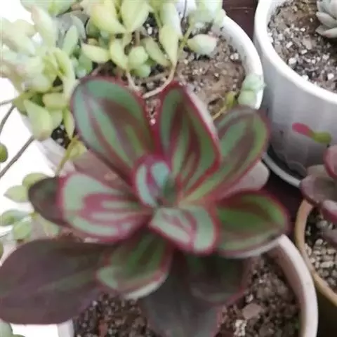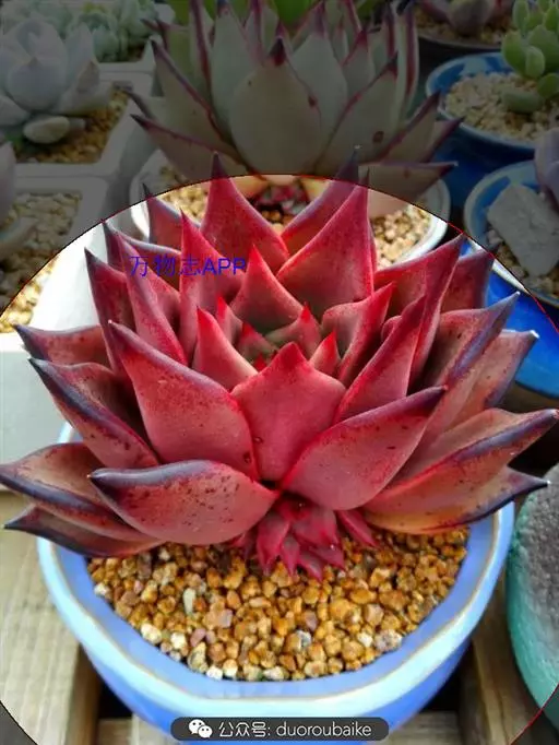 小红衣是景天科、拟石莲花属的一种多肉植物。叶片匙形,扁平细长,叶表具白粉,有明显的半透明边缘,…
