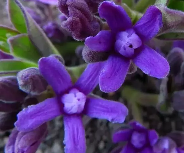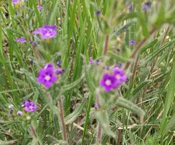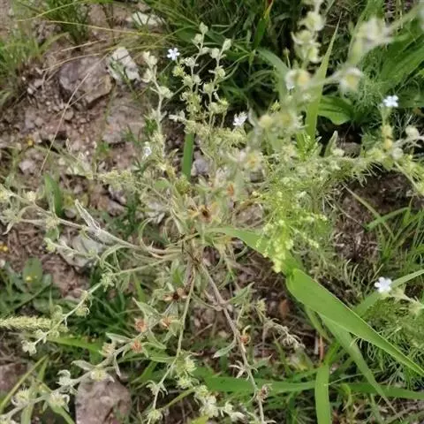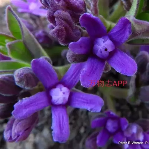 多年生草本植物,高30-60cm,叶披针形,有毛,基生叶丛生。疏生一侧螺旋状聚伞花序;花鲜紫色至紫色,花小,径约6MM。