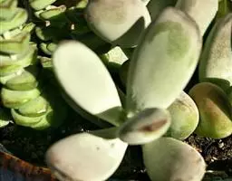 福娘为景天科银波锦属的肉质草本植物。对生的叶片呈短棒状,叶色灰绿,表覆白粉,叶缘外围镶着紫红色,…