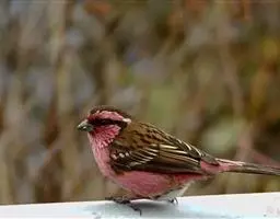 喜马拉雅白眉朱雀(学名:Carpodacus thura):小型鸟类,体长15-17厘米,体重24-35克。额基、眼先深红色,前额和一条长而宽阔的眉纹珠白色沾有粉红色并具丝娟光泽,在暗色的头部极为醒目。头顶至背棕褐或红褐色、具黑褐色羽干纹,腰紫粉红色或玫瑰红色。头侧、颊和下体玫瑰红色或紫粉红色,喉和上胸具细的珠白色,腹中央白色。