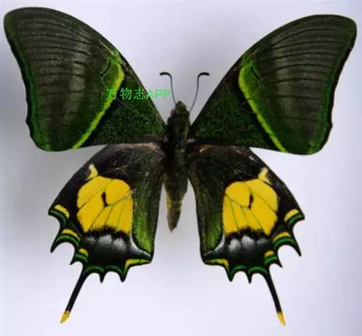 翅展80—100mm。身体、翅面大部分翠绿色,雌雄异型。
