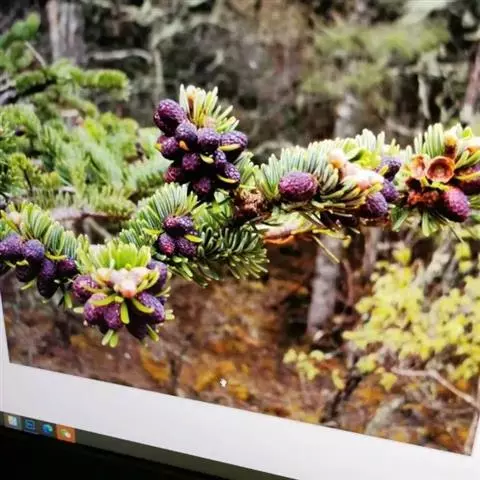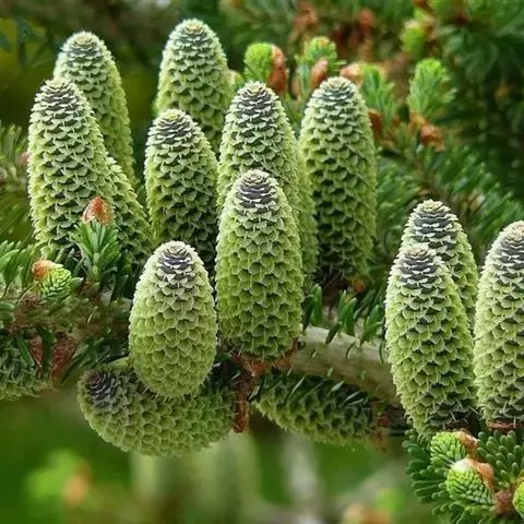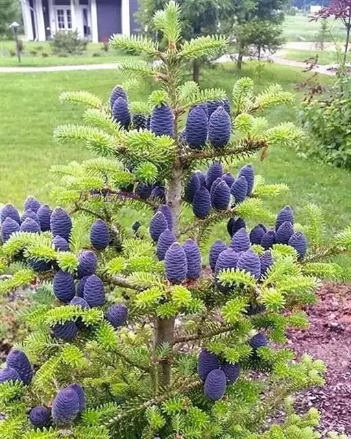 球果卵状圆柱形或短圆柱形,基部稍宽,顶端圆或微凹,有短梗,熟时暗黑色或淡蓝黑色,微被白粉,长6-11厘米,径3-4.5厘米;中部种鳞扇状四边形,长1.4-2厘米,宽1.6-2.4厘米,上部宽厚,边缘内曲,下部两侧耳状,基部窄成短柄状;苞鳞微露出,长1.2-1.8厘米,上端宽圆,边缘有细缺齿,中央有急尖的尖头,尖头通常向后反曲;种子长椭圆形,较种翅长或近等长,种翅黑褐色,楔形,上端截形,连同种子长1.3-1.9厘米。花期5月,球果10月成熟。