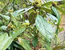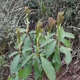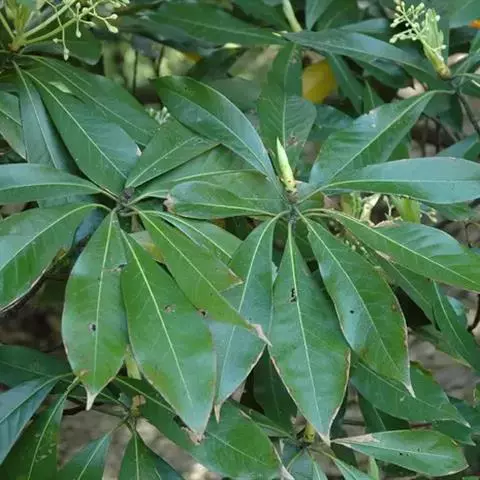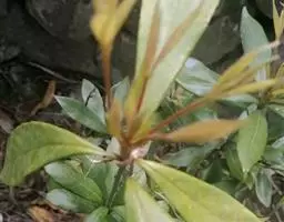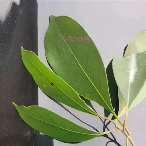 顶芽卵形,鳞片近圆形,外面密被灰黄色绢毛,近边缘无毛,浅棕色。叶椭圆形或椭圆状倒披针形,长5-10(13.5)厘米,宽2-5厘米,先端渐尖或尾状渐尖,尖头钝,基部楔形,革质,上面绿色,无毛,下面有贴伏小柔毛,嫩叶的下面和叶柄密被灰黄色小柔毛,中脉上面凹下,下面明显凸起,侧脉每边8-10条,在两面均不明显,小脉细密,联结成细网状,在上面构成蜂巢状小窝穴,下面不明显;叶柄稍细弱,长10-15毫米,无毛,上面有浅沟。