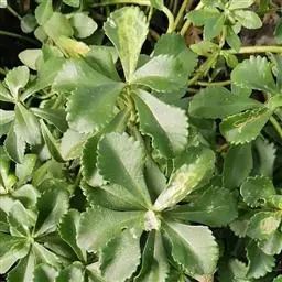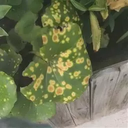 发病叶初期先出现黑褐色斑点,病斑边缘绿色,中间灰白色,有时破裂穿孔,直至叶片枯死。