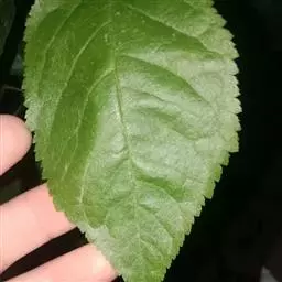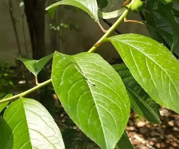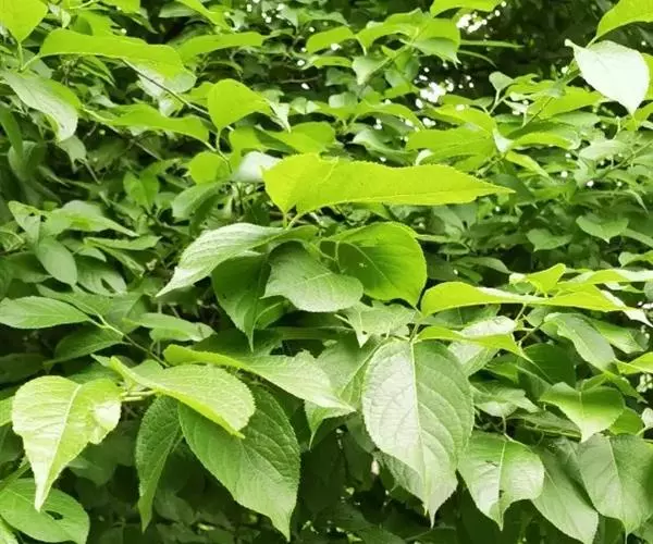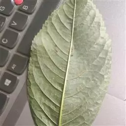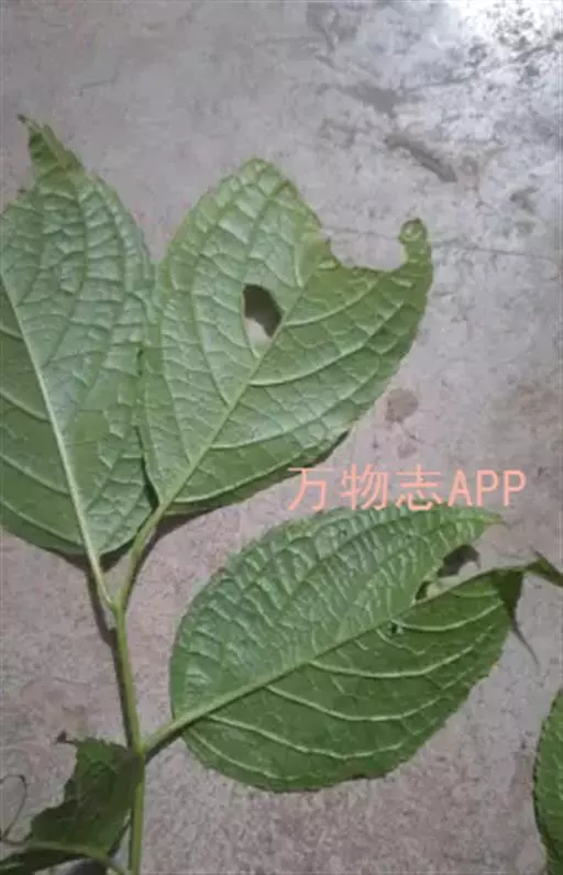 叶椭圆形、卵形或矩圆形,薄革质,长6-15厘米,宽3.5-6.5厘米。基部圆形或阔楔形,先端渐尖;上面暗绿色,初时有褐色柔毛,不久变秃净,老叶略有皱纹,下面淡绿,初时有褐毛,以后仅在脉上有毛。侧脉6-9对,与网脉在上面下陷,在下面稍突起,边缘有锯齿,叶柄长1-2厘米,上面有槽,被散生长毛。
