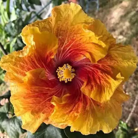 花单生枝顶叶腋;花梗粗壮,长2厘米,被黄色星状茸毛,脱落;萼杯状,近革质,高1.5厘米,直径1.3厘米,疏被星状柔毛,内面无毛,截平或具3-6枚不明显的浅齿,宿存,基部有2-3枚圆形腺体;花瓣淡黄绿色,狭披针形至线形,长达15厘米,上半部反卷;雄蕊管较短,分裂为多数雄蕊束,每束再分裂为7-10枚细长的花丝,花丝连雄蕊管长13-15厘米,下部黄色,向上变红色,花药狭线形,弧曲,长2-3毫米,横生;花柱长于雄蕊,深红色,柱头小,5浅裂。