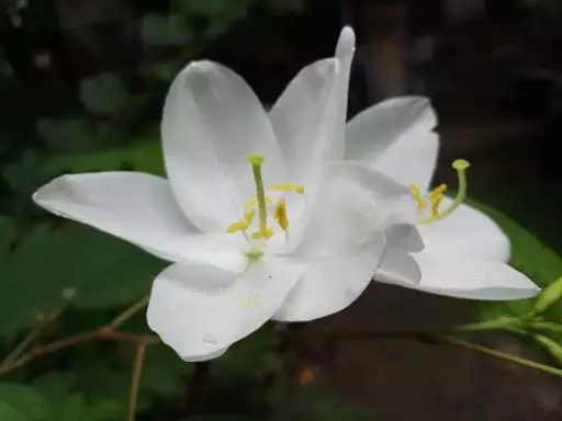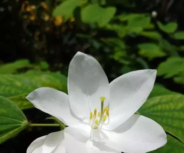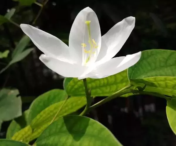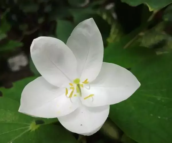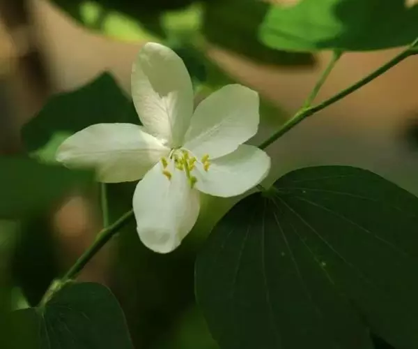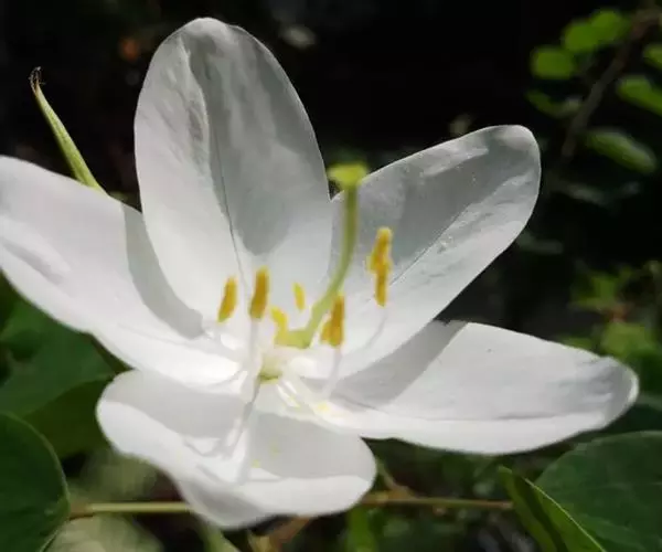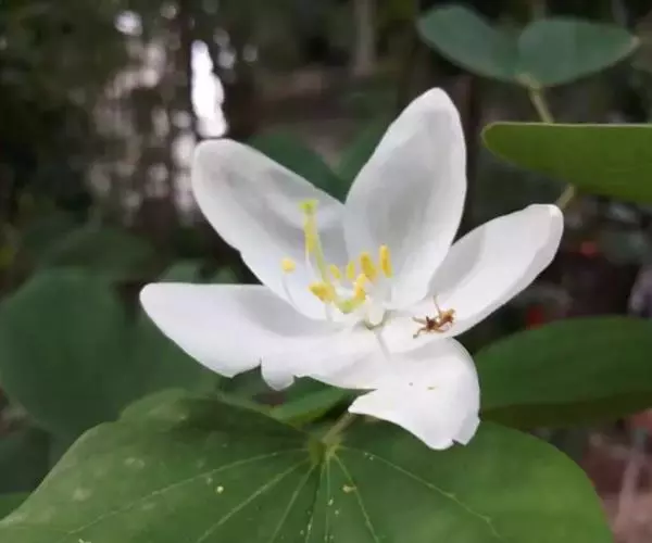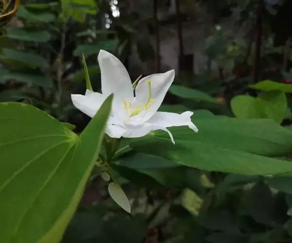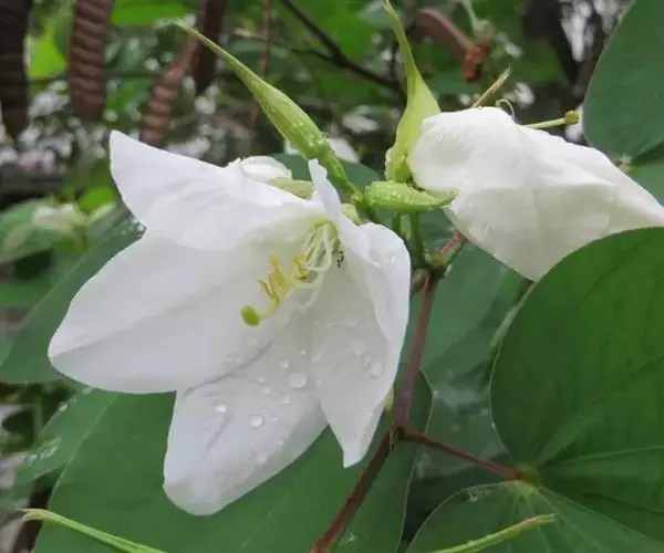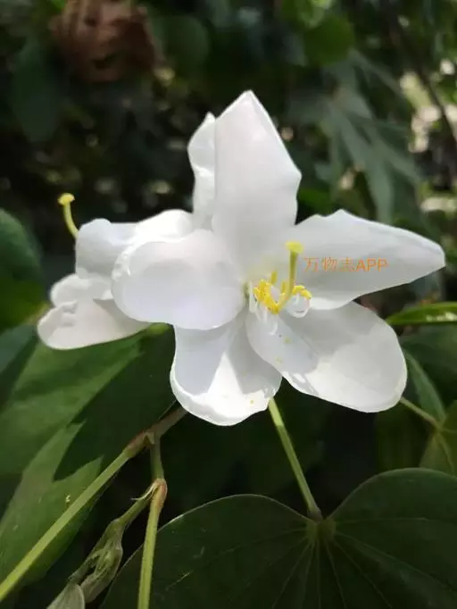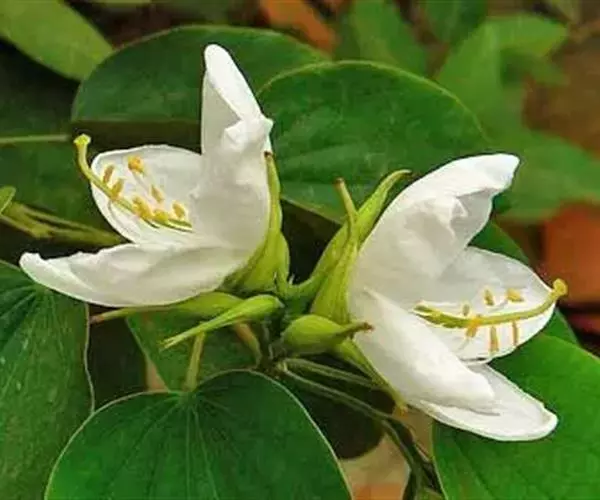 白花羊蹄甲的花数朵聚生,芳香,五杖分离花瓣,观赏花,白色。花期:春天,春天开花,先开花后才出叶,树上一片白色,相当容易辨认。