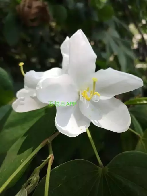 小乔木或灌木;小枝之字曲折,无毛。叶近革质,卵圆形,有 时近圆形,长9-12厘米,宽8-12.5厘米,基部通常心形,先端2裂约达叶长的1/3-2/5,裂片先端急尖或稍渐尖,很少呈圆形,上面无毛,下面被灰色短柔毛;基出脉9-11条,与支脉及网脉在叶下面均极明显凸起;叶柄长2.5-4厘米,具沟,被短柔毛。总状花序腋生,呈伞房花序式,密集,少花(3-15朵);总花梗短,与花序轴均略被短柔毛;苞片与小苞片线形,具线纹,被柔毛;花蕾纺锤形,长约2.5厘米,略被毛或无毛,先端渐尖,顶冠以5条长约3毫米,锥尖、被毛的萼齿;萼佛焰状,一边开裂,顶端有5枚短的细齿;花瓣白色,倒卵状长圆形,长3.5-5厘米,宽约2厘米,无瓣柄;能育雄蕊10枚,2轮,花丝长短不一,长1.5-2.5厘米,下部1/3被毛,花药长圆形,黄色;子房具长柄,略被柔毛或近无毛被柔毛或近无毛略被柔毛或近无毛花柱长15-20毫米,柱头盾状,直径3毫米。荚果线状倒披针形,扁平,直或稍弯,先端急尖,具直的喙(宿存花柱),长6-12厘米,宽1.5厘米,内有隔膜,果颈长1厘米,果瓣革质,无毛,近腹缝处有1条隆起、锐尖的纵棱;种子5-12颗,直径8-10毫米,扁平。花期4-6月或全年;果期6-8月。