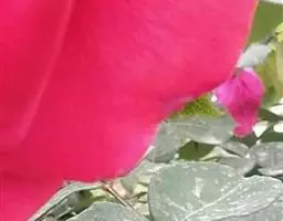 (二)植物学特征:树姿较开张,1年生枝红褐色,有光泽,节间平均长2.28厘米,叶片长15.38厘米,宽3.71厘米,蜜腺肾形,2~4个,叶柄长1.20厘米。花为蔷薇型,花冠大,冠径4.32厘米,深粉红色,花粉能育、量多;雌蕊比雄蕊稍低,萼筒内壁淡黄色。
