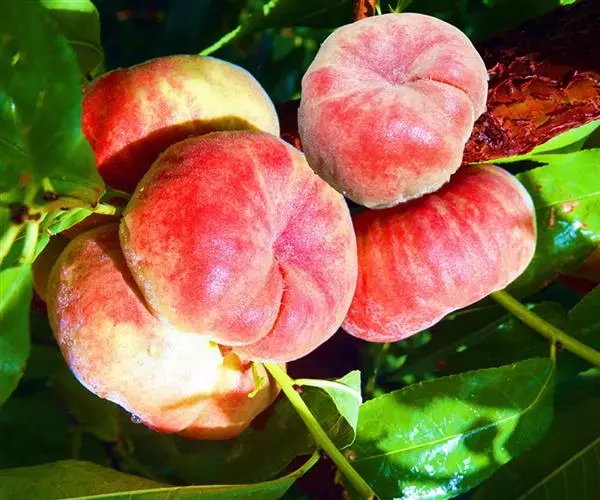 6.美国大红蟠:系从美国引进的大果型蟠桃新品种,果实在黄淮地区7月底成熟,平均单果重220克。果形扁圆,果面鲜红色,可溶性固形物含量为14.5%,味甜。