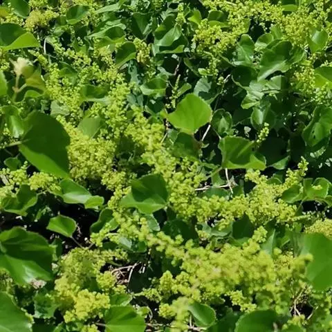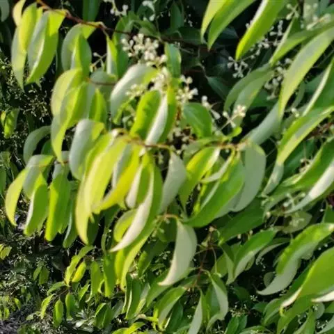 肉桂花 圆锥花序腋生或近顶生,长8-16厘米,三级分枝,分枝末端为3花的聚伞花序,总梗长约为花序长之半,与各级序轴被黄色绒毛。花白色,长约4.5毫米;花梗长3-6毫米,被黄褐色短绒毛。花被内外两面密被黄褐色短绒毛,花被筒倒锥形,长约2毫米,花被裂片,卵状长圆形,近等大,长约2.5毫米,宽1.5毫米,先端钝或近锐尖。能育雄蕊9,花丝被柔毛,第一、二轮雄蕊长约2.3毫米,花丝扁平,长约1.4毫米,上方1/3处变宽大,花药卵圆状长圆形,长约0.9毫米,先端截平,药室4,室均内向,上2室小得多,第三轮雄蕊长约2.7毫米,花丝扁平,长约1.9毫米,上方1/3处有一对圆状肾形腺体,花药卵圆状长圆形,药室4,上2室较小,外侧向,下2室较大,外向。退化雄蕊3,位于最内轮,连柄长约2毫米,柄纤细,扁平,长1.3毫米,被柔毛,先端箭头状正三角形。子房卵球形,长约1.7毫米,无毛,花柱纤细,与子房等长,柱头小,不明显。