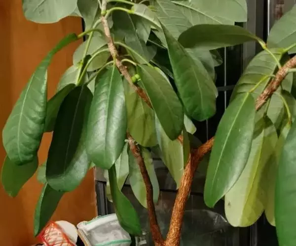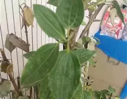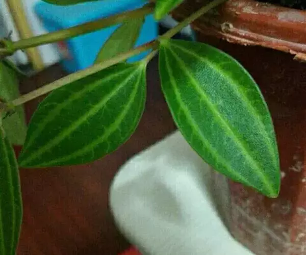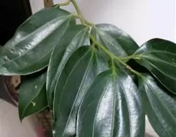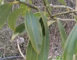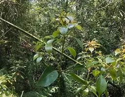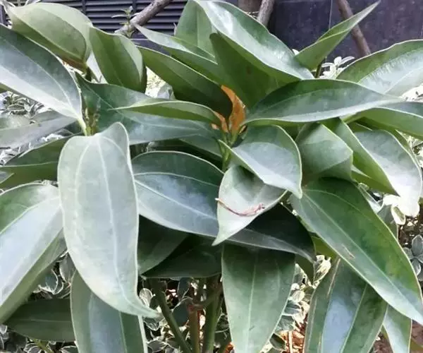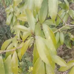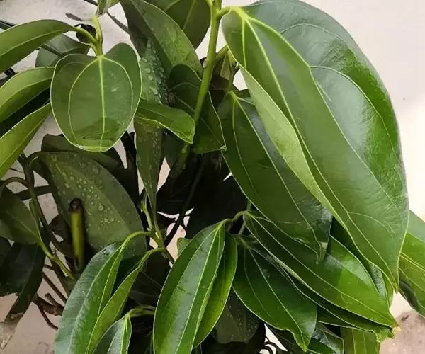 顶芽小,长约3毫米,芽鳞宽卵形,先端渐尖,密被灰黄色短绒毛。叶互生或近对生,长椭圆形至近披针形,长8-16(34)厘米,宽4-5.5(9.5)厘米,先端稍急尖,基部急尖,革质,边缘软骨质,内卷,上面绿色,有光泽,无毛,下面淡绿色,晦暗,疏被黄色短绒毛,离基三出脉,侧脉近对生,自叶基5-10毫米处生出,稍弯向上伸至叶端之下方渐消失,与中脉在上面明显凹陷,下面十分凸起,向叶缘一侧有多数支脉,支脉在叶缘之内拱形连结,横脉波状,近平行,相距3-4毫米,上面不明显,下面凸起,其间由小脉连接,小脉在下面明显可见;叶柄粗壮,长1.2-2厘米,腹面平坦或下部略具槽,被黄色短绒毛。