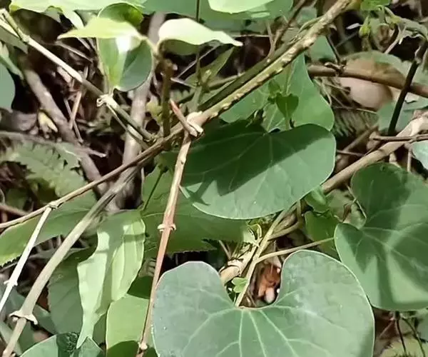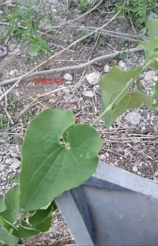 草质藤本;根圆柱形,细长,黄褐色,内面白色;茎无毛,干后有槽纹, 管花马兜铃 嫩枝、叶柄折断后渗出微红色汁液。叶纸质或近膜质,卵状心形或卵状三角形,极少近肾形,长3-15厘米,宽3-16厘米,顶端钝而具凸尖,基部浅心形至深心形,两侧裂片下垂,广展或内弯,湾缺通常深2-4厘米,边全缘,上面深绿色,下面浅绿色或粉绿色,两面无毛或有时下面有短柔毛或粗糙,常密布小油点;基出脉7条,叶脉干后常呈红色;叶柄长2-10厘米,柔弱。