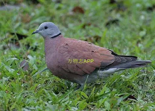 雄鸟额、头顶至后颈蓝灰色,头侧和颈侧亦为蓝灰色,但稍淡。颏和喉上部白色或蓝灰白色,后颈有一黑色领环横跨在后颈基部,并延伸至颈两侧。背、肩、翅上覆羽和三级飞羽葡萄红色,腰、尾上覆羽和中央尾羽暗蓝灰色,其余尾羽灰黑色,具宽阔的白色端斑。最外侧尾羽外翈白色;飞羽暗褐色。喉至腹部淡葡萄红色,尾下覆羽白色。两胁、覆腿羽、肛周、翅下覆羽和腋羽均蓝灰色。雌鸟额和头顶淡褐而沾灰,后颈基处黑色领环较细窄,不如雄鸟明显,且黑色颈环外缘以白边。其余上体深土褐色,腰部缀有蓝灰色。下体浅土褐色,略带粉红色。颏和喉白色或近白色。下腹、肛周和尾下覆羽淡灰色或蓝白色。虹膜暗褐色,嘴黑色,基部较浅淡,脚褐红色,爪黑褐色。 [2-3]