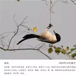 灰喜鹊:属雀形目、鸦科的中型鸟类。外形酷似喜鹊,但稍小。体长33-40厘米。嘴、脚黑色,额至后颈黑…