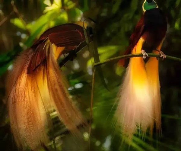 在繁殖期换上一身华丽的羽毛,在树枝上做出各种夸张动作,试图吸引雌性的眼球。 雄鸟展开华丽羽饰于树梢巡游,并形成一种层次,羽饰最华丽者占据最高位置。它们的初始姿势很有特点:翅膀弯如旋浆状,尾向下拱,身侧羽毛蓬松垂落如瀑布。雄鸟在树梢喧嚣跳跃,当雌鸟出现时,雄鸟回归各自位置继续踱步,并保持求偶的羽饰姿态。被雌鸟选中的雄鸟会伫立不动。 该鸟可能与新几内亚极乐鸟进行杂交。