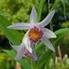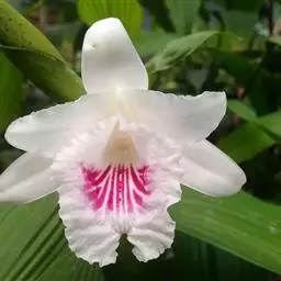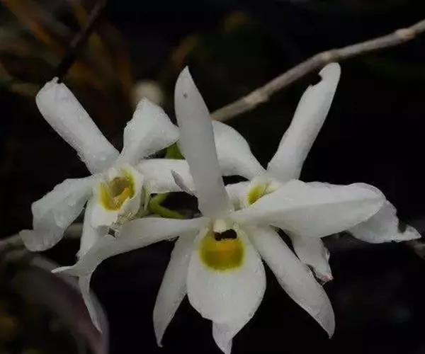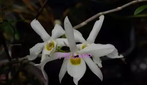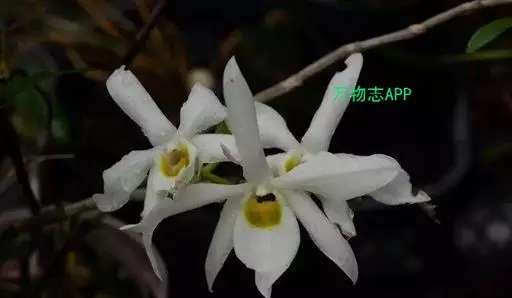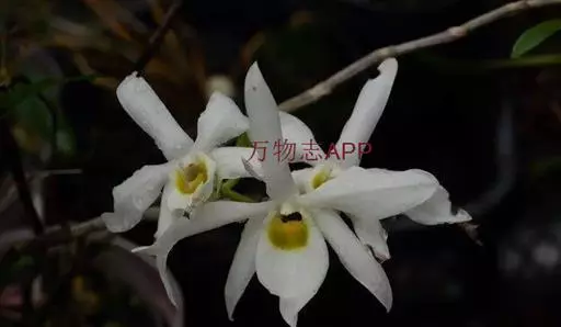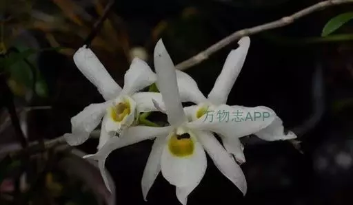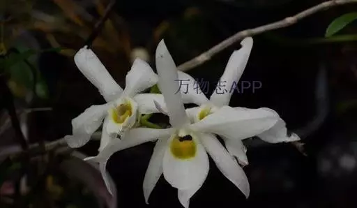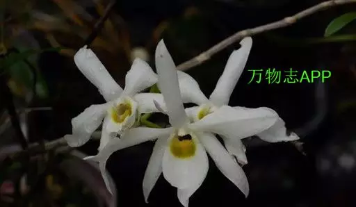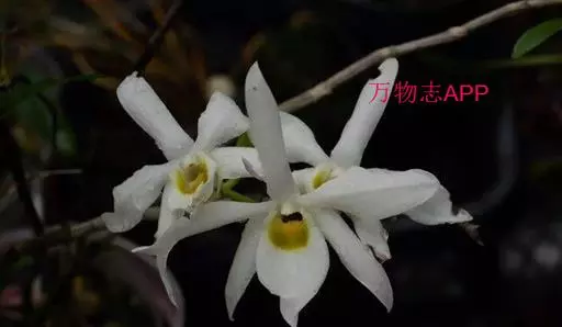 广东石斛(学名:Dendrobium wilsonii Rolfe ):茎直立或斜立,细圆柱形,不分枝,具少数至多数节。叶革质,二列、数枚,互生于茎的上部,狭长圆形。总状花序1-4个,从落了叶的老茎上部发出,具1-2朵花;花大,乳白色,有时带淡红色,开展;花瓣近椭圆形,长2.5-4厘米,宽1-1.5厘米,先端锐尖,具5-6条主脉和许多支脉;唇瓣卵状披针形,比萼片稍短而宽得多,3裂或不明显3裂,基部楔形,其中央具1个胼胝体。花期5月。