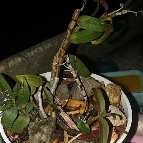 广东石斛 广东石斛茎直立或斜立,细圆柱形,通常长10-30厘米,粗4-6毫米,不分枝,具少数至多数节,节间长1.5-2.5厘米,干后淡黄色带污黑色。叶革质,二列、数枚,互生于茎的上部,狭长圆形,长3-5 (-7)厘米,宽6-12 (-15) 毫米,先端钝并且稍不等侧2裂,基部具抱茎的鞘;叶鞘革质,老时呈污黑色,干后鞘口常呈杯状张开。