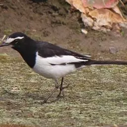 日本鹡鸰:体长约20厘米。上体多黑色,额、颏及眉纹白,下体白,两翼黑而具白色横斑及羽缘,…