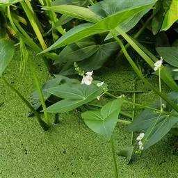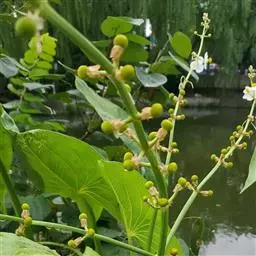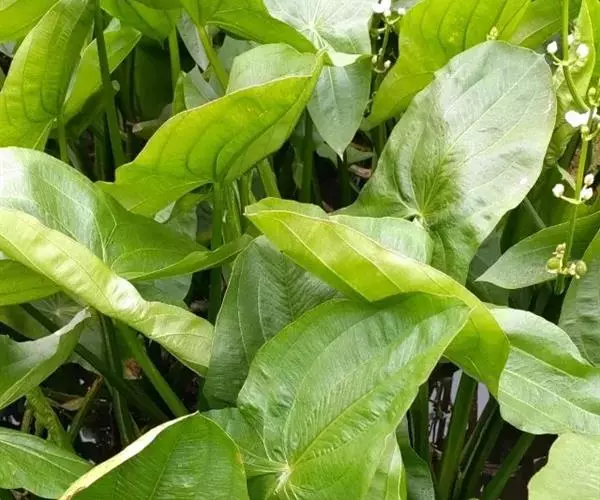 慈姑(学名:Sagittaria trifolia L. var. sinensis (Sims.) Makino )泽泻科多年生草本植物,生在水田里,叶子像箭头,开白花。地下有球茎,黄白色或青白色,以球茎作蔬菜食用。可以吃。也作茨菰。本变种与原变种不同在于:植株高大,粗壮;叶片宽大,肥厚,顶裂片先端钝圆,卵形至宽卵形;匍匐茎末端膨大呈球茎,球茎卵圆形或球形,可达5-8×4-6厘米;圆锥花序高大,长20-60厘米,有时可达80厘米以上,着生于下部,具1-2轮雌花,主轴雌花3-4轮,位于侧枝之上;雄花多轮,生于上部,组成大型圆锥花序,果期常斜卧水中;果期花托扁球形,直径4-5毫米,高约3毫米。种子褐色,具小凸起。
