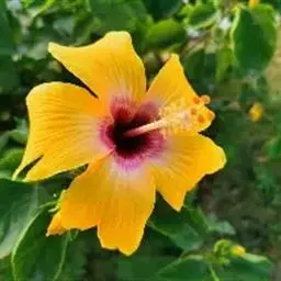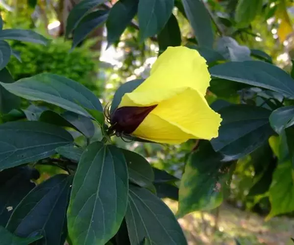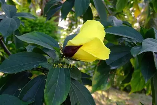 樟叶槿(Hibiscus grewiifolius Hassk)为锦葵科木槿属植物。常绿小乔木,高可达7 m。叶纸质至近革质,卵状长圆形至椭圆状长圆形,先端短急尖,基部钝至阔楔形,两面均平滑无毛,上面暗绿色,下面苍绿色。花硕大,黄色,全年不定时开花。果单生于上部叶腋间。