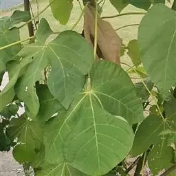 叶纸质至近革 质,卵状长圆形至椭圆状长圆形,长8-15厘米,宽6-7厘米,先端短渐尖,基部钝至阔楔形,全缘,两面均平滑无毛,上面暗绿色,下面苍绿色,基生脉3 (-5)条,在下面隆起,叶柄长2-4.5厘米,疏被短柔毛;托叶小,早落。花未见。