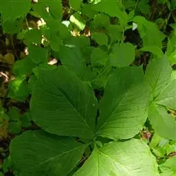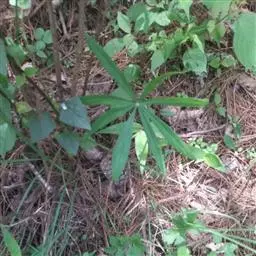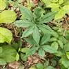 螃蟹七又名紫盔天南星、城口天南星。多年生草本。块茎扁球形,直径3-5cm,常具多数小球茎。鳞叶3,褐色,宽2-2.5cm,向上渐狭,最上的长约15cm。叶柄长20-40cm,粗6-7mm,下部1/4具鞘;叶片3深裂至3全裂,裂片全缘,中裂片近菱形,卵状长圆形至卵形,长17-32cm,宽15-25cm;侧裂片斜椭圆形,长9-23cm,宽6-16cm;中肋背面隆起,侧脉9-10对,集合脉距边缘约5mm。花序柄比叶柄短而细,长18-26cm。佛焰苞紫色,有苍白色线状条纹,管部近圆柱形,长4-8cm,直径1.5-2cm,喉部边缘耳状反卷;檐部长圆三角形,拱形下弯或近直立,长6-12cm,宽4-4.5cm,长渐尖,具长1-4cm的尾尖。肉穗花序单性,雄花序长2.5-3cm,圆柱形,粗4-5mm,雄花有花药2-4,药室卵圆形,基部叉开,顶孔开裂;雌花序长约2cm,子房具棱,顶部常圆形,花柱极短而粗,柱头有毛;附属器粗壮,圆锥状,长约4.5-9cm,基部骤狭成短柄,上部长渐尖,先端钝,粗1.5-5mm,近直立或上部略弯。花期5-6月。