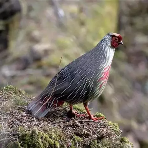 体大的灰褐色鹑类。胸灰色具黑色细纹。与相似种类四川雉鹑不同处在于栗色喉块外缘近白。有猩红色眼周裸皮。…