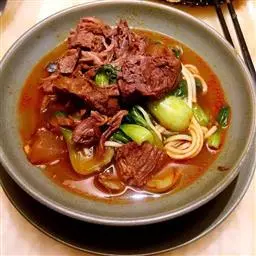 牛肉切成片,葱切成段。 将豆瓣酱放入热锅中,炒香。 高汤倒入锅中,放入牛肉片、葱段。 在锅中煮3分钟。加入调料 、收汁即可。