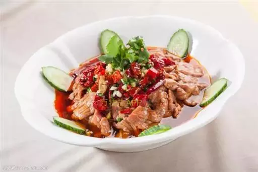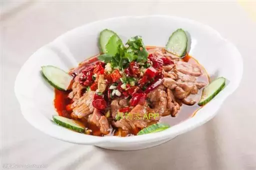 特色传统名菜,属川菜系。主料瘦黄牛肉。辅料豆芽、鸭血、肉汤、莴笋或者其他蔬菜、粉丝。调料葱、精盐、酱油、花椒、味精、熟菜油、干辣椒、辣椒油、胡椒粉、醪糟汁、湿淀粉、郫县豆瓣酱。因菜中牛肉片是在辣味汤中烫熟,故名水煮牛肉。