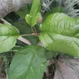 叶片卵形或椭圆形,长5-11厘米,宽4-5.5厘米,先端急尖或渐尖,基部圆形或宽楔形,边缘有细锐锯齿,上面有短柔毛,逐渐脱落,下面密被短柔毛;叶柄长1.5-5厘米,具短柔毛;托叶小,膜质,披针形,早落。