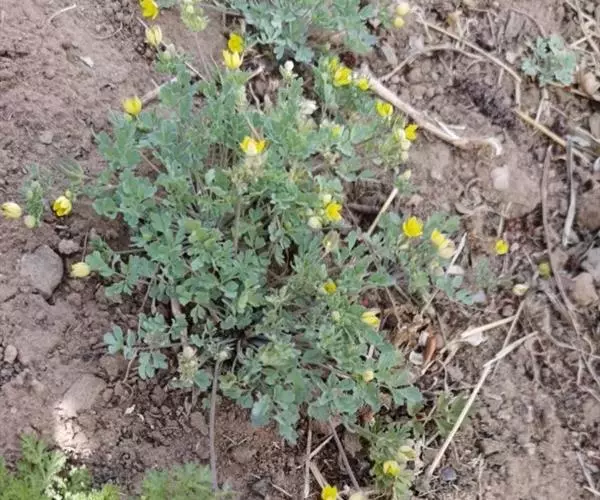 直根细长,粗径2-3.5毫米,生少数侧根。茎(2-)4-9(-17)条,多少斜升,生少数分枝,高8-30厘米。基生叶多数,无毛;叶片轮廓三角状卵形,长0.8-2.7厘米,宽1-3厘米,三全裂,中全裂片等边菱形,长达12毫米,宽达11毫米,下延成的细柄,常再三深裂,深裂片长椭圆状倒卵形至线状狭倒卵形,常具1-4个钝锯齿,侧全裂片通常无柄,不等二深裂;叶柄长2.5-13厘米。茎生叶1-2,小。花小,直径3-5毫米;花梗纤细,长3-30毫米;萼片椭圆形,淡黄色,长3-4.5毫米,宽1.7-2毫米,具3条脉,顶端钝或急尖;花瓣长约1毫米,近二唇形,上唇顶端圆,下唇较短;雄蕊通常10-15,花药淡黄色,长0.5毫米左右,花丝长约2.5毫米;心皮6-20,长约2毫米,无毛。蓇葖直立,线状长椭圆形,长8-10毫米;种子4-14粒,卵球形或狭卵球形,长0.5-0.7毫米。5-6月开花,6-7月结果。