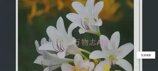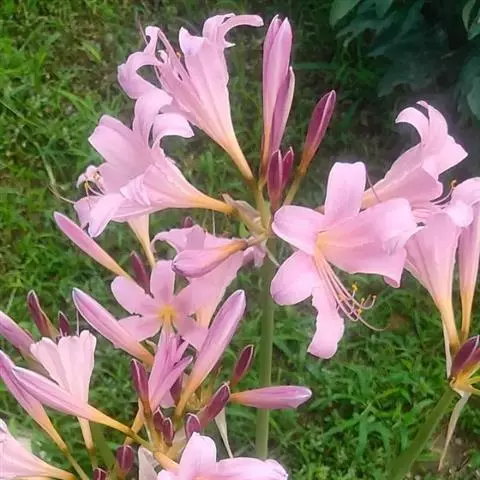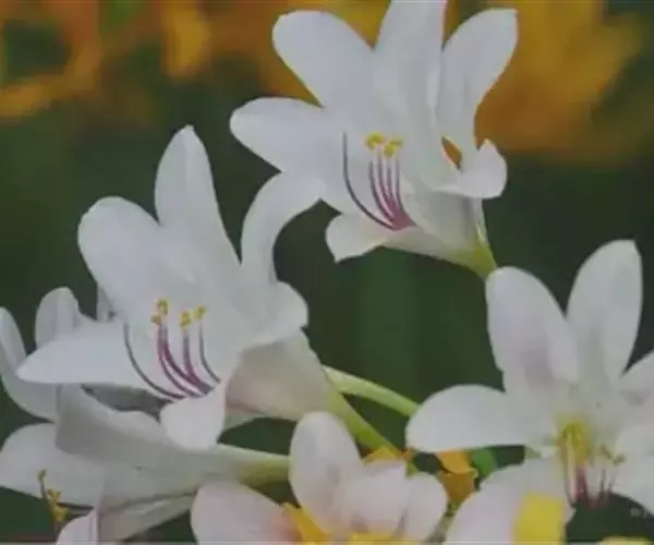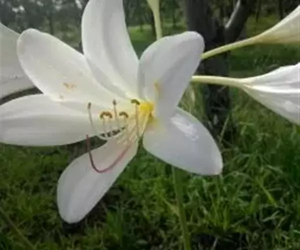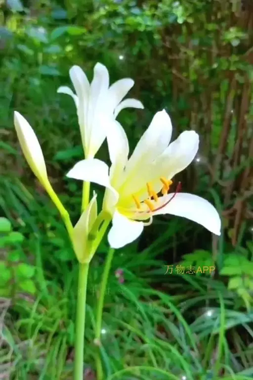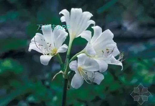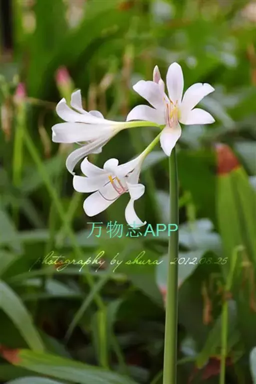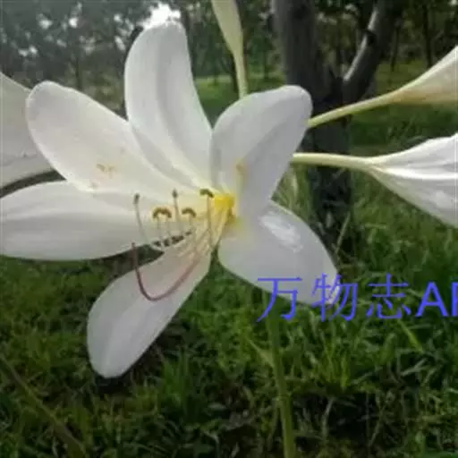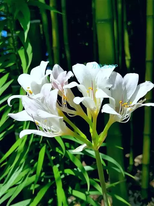 长筒石蒜(花) 长筒石蒜为多年生植物。鳞茎卵球形,直径约4 厘米。早春出叶,叶披针形,长约38厘米,一般宽1.5厘米,部最宽处达2.5厘米,顶端渐狭、圆头,绿色,中间淡色带明显。花茎高60-80厘米;总苞片2枚,披针形,长约5厘米,顶端渐狭,基部最宽达1.5厘米;伞形花序有花5-7朵;花白色,直径约5厘米;花被裂片腹面稍有淡红色条纹,长椭圆形,长6-8厘米,宽约1.5厘米,顶端稍反卷,边缘不皱缩,花被筒长4-6厘米;雄蕊略短于花被;花柱伸出花被外。花期7-8月。 有蒴果,结籽少。