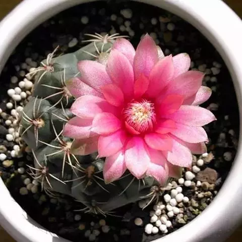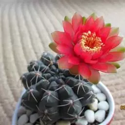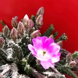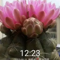 绯花玉 Speg.)是仙人掌科、裸萼球属多肉植物,植株呈扁球形,表皮墨绿色,刺针状,…